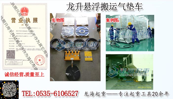 悬浮气垫搬运车(又叫气垫搬运车或悬浮搬运气垫),是一款很轻机动性很强的搬运设备,是由空气控制器、气垫模块、气囊、连接软管等组成,可悬浮地面搬运,以达到省力、灵活、保护地面的作用,为龙海起重“龙升牌”产品。厂家直销,现货供应,保质12个月!