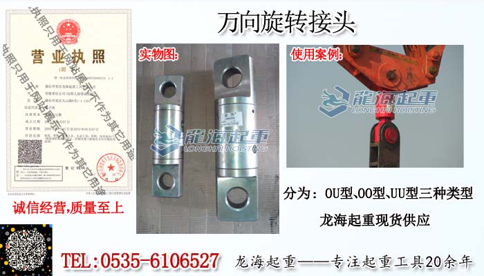 万向旋转接头又叫做旋转万向接头和万向接头,为龙海起重“龙升牌”产品,与钢丝绳配套使用,防止钢丝绳打结,广泛用于矿山、船舶、油田、电力、隧道等场合起吊作业。龙海起重厂家直销,现货供应,保质3个月!