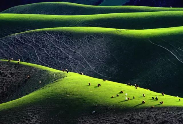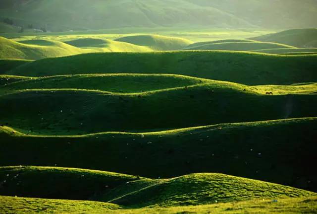 印象中的草原,大多是“天苍苍,野茫茫,风吹草地见牛羊”的广阔无垠,一马平川,视野极为开阔。但特克斯的琼库什台草原,则充满了凹凸有致的曲线美。