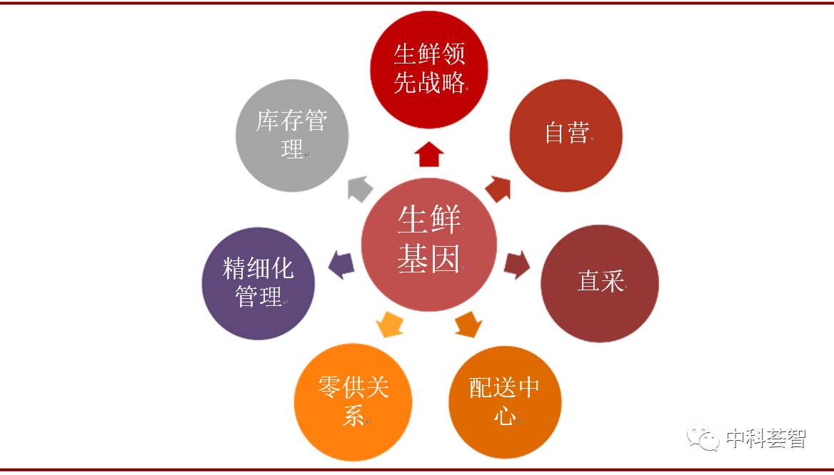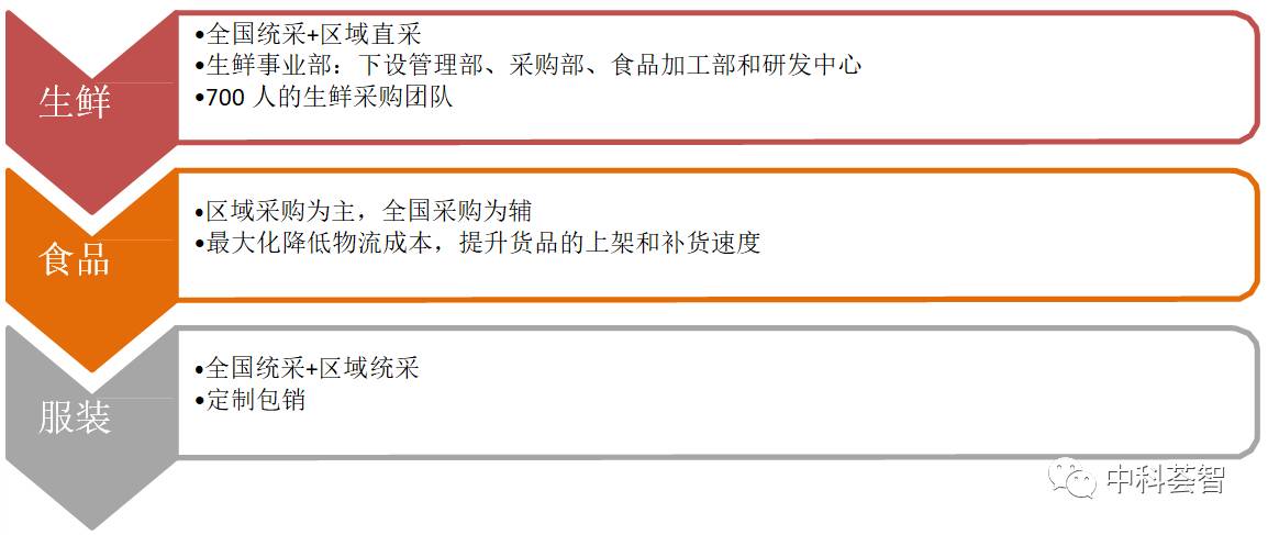 永辉除生鲜外还经营食品用品和服装,三个品类都有特定的采购模式,最有特点的是生鲜的采购。永辉生鲜的全国性统采和区域直采体系,加上生鲜研发中心对全国各地农产品的深入研 究,最大限度的减少了“产地—门店—顾客”的生鲜产业链的中间环节,降低了物流、 仓储和损耗成本,保持了生鲜产品的色香味和低价优势。