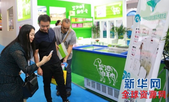 参会企业嘉宾在盐池滩羊展台前扫码关注滩羊产品。刘海燕 摄