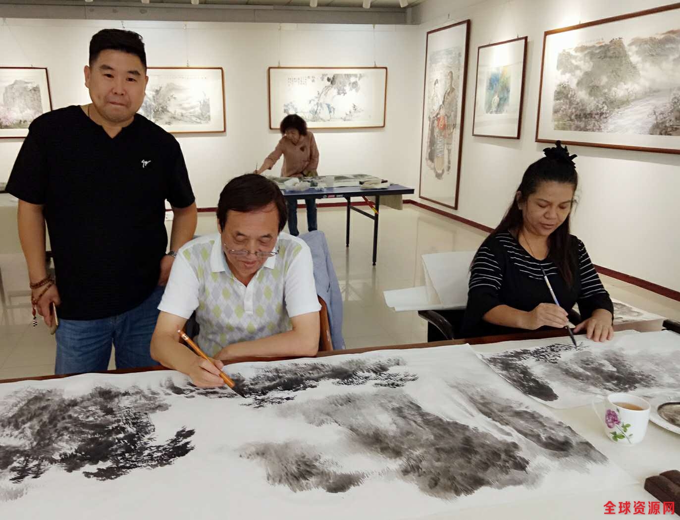 画家管敬革与台湾国立大学教授卢锡炯同桌创作山水画