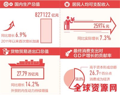 按可比价格计算,2017年我国GDP同比增长6.9%,实现自2011年以来的首次增长加速,改变了多年来经济增速单向放缓的状况。在增长保持平稳的同时,我国城镇新增就业人数超过1300万,CPI上涨1.6%,外汇储备年末近31400亿美元……中国经济运行在合理区间,稳的格局更加巩固。