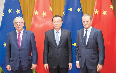 李克强与欧洲理事会主席图斯克、欧盟委员会主席容克共同主持第二十次中国欧盟领导人会晤