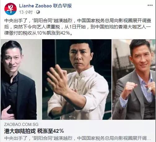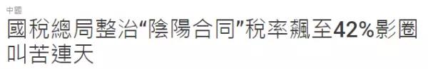 8月5日,新加坡《联合早报》网站用这句话作为开头报道称,在“阴阳合同”越演越烈之际,国家税务总局向影视圈展开调查,并突然下令向艺人收重税,税率从此前的10%左右“飙涨”至42%。