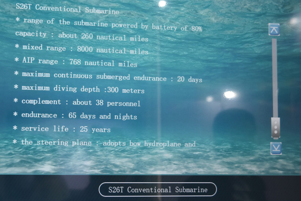 S-26T实际上是脱胎于中国海军装备的039A/B型常规动力潜艇的外贸版潜艇,根据公开的资料显示,这款外贸型潜艇水上排水量约1800吨,水下排水量约2500吨,艇长77.7米,舷宽8.6米,高9.2米,潜深300米,艇员数量为38人。潜艇的最高航速为17节,在电池电量为80%的情况下,航程可达到260海里。在使用AIP系统时,航程则达到768海里。潜艇一次性最多能在水下潜航20天。如果混合使用AIP动力和柴电动力,其航程可达8000海里。潜艇的自持力为65昼夜,服役寿命为25年。