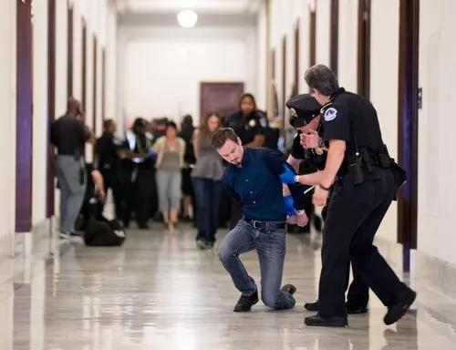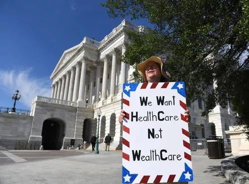 ▲资料图片:2017年6月27日,一名女子在美国华盛顿国会山抗议医改法案。(新华社记者 殷博古 摄)