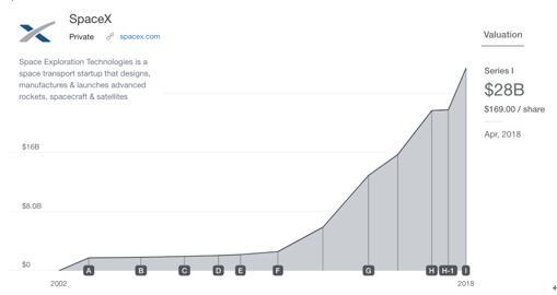 截止2018年10月,SpaceX的最新一轮融资估值已经达到280亿美元以上,比起十年前2007年C轮的3亿美元估值,今天的估值已经增长了93倍。
