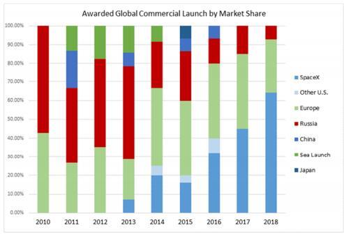 2010年-2018年全球商业航天领域市场份额分布,source:NASA