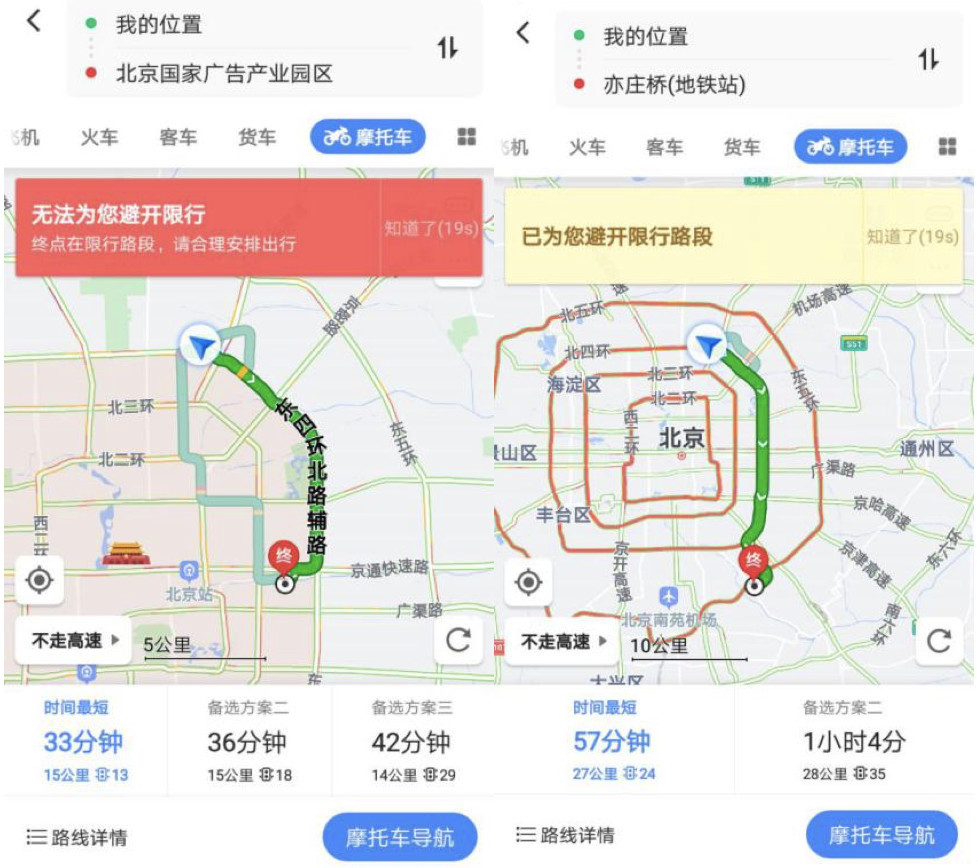 当用户规划摩托车骑行路线时,如果目的地在禁限行区域内,高德地图会清楚标记全城禁限行区域,给予用户提示。如果目的地在禁限行区域外,高德地图会为用户自动避开禁限行区域,推荐最佳骑行路线。