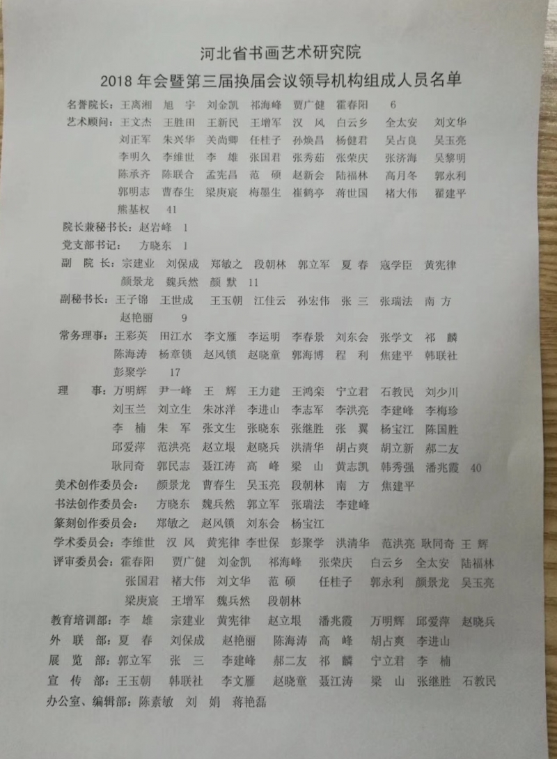 全球资讯网河北(赵岩峰 赵献刚)讯:1月5日,河北省书画艺术研究院2018年会、2019年工作会议暨第三届换届大会在省会石家庄市顺利召开。今天本次会议来自全国各地理事以上领导成员126名,新增25名新成员,研究员200名。