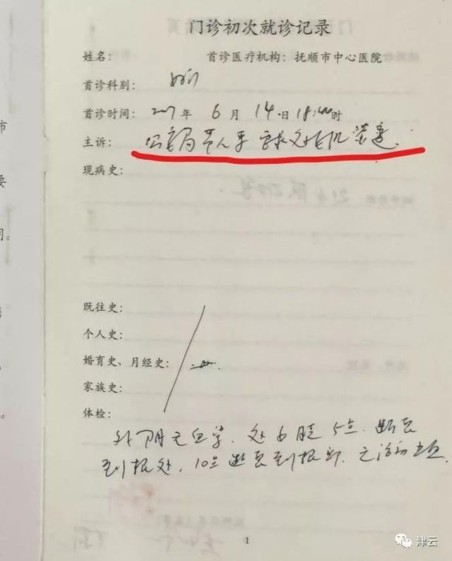 “处女膜5点(方位)断裂到根处,10点(方位)断裂到根部”,医院出具的一份《抚顺市通用门诊病历》记载道。