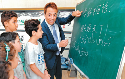 在浙江义乌工商职业技术学院涉外人员服务中心, 哈米(右一)教中东国家的小朋友说普通话。2003年, 伊朗商人哈米来到义乌, 做丝巾生意。2007年,他和中国籍妻子成立了义乌市首家由外商创办并拥有进出口权的外贸公司, 如今已在北京、上海和广州开设了分公司,并把生意做到了亚洲、欧洲和北美洲的许多城市。能说一口流利普通话的哈米以“新义乌人”的身份为荣。