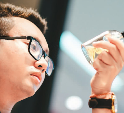 中国小伙陈宇在泰国曼谷一家精油美容用品商店了解新上市的产品。