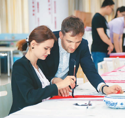 在山东省临沂市拓普网络股份有限公司书画院,来自乌克兰的玛丽娜(左)与男朋友亚历山大一起练习中国书法。二人于2014年来到这里工作。