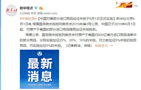 新华社北京6月1日电 根据国务院关税税则委员会2019年第3号公告,中国已于2019年6月1日起,对原产于美国的部分进口商品提高加征关税税率。