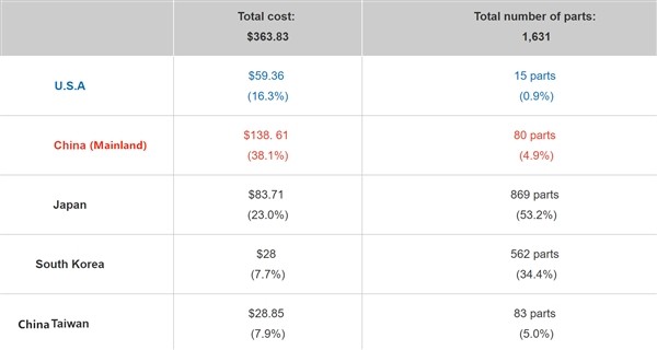 拆解并认真分析后,Fomalhaut Techno Solutions给出的分析报告称,P30 Pro中共有1631个元器件,其中日本企业供应的零部件为869个,占比达到了53.2%,而美国企业只供应了15个元器件,占比只有0.9%。
