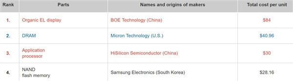 具体到物料成本方面,P30 Pro最贵的零部件是OLED屏,供应方是京东方,成本价格是84美元;成本第二的便是美光的DRAM内存芯片,成本40.96美元;3、4名分别是30美元的麒麟980芯片和28.16美元的三星闪存。至于日企,核心部件最主要的是来自索尼的CMOS传感器。