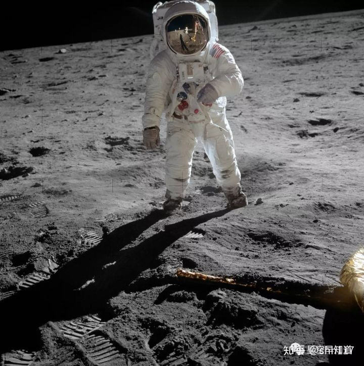 站在月球表面的奥尔德林,拍摄者是阿姆斯特朗。这张照片很巧妙,它把两位宇航员都拍进去了,你看出来了吗?(提示:注意头盔)