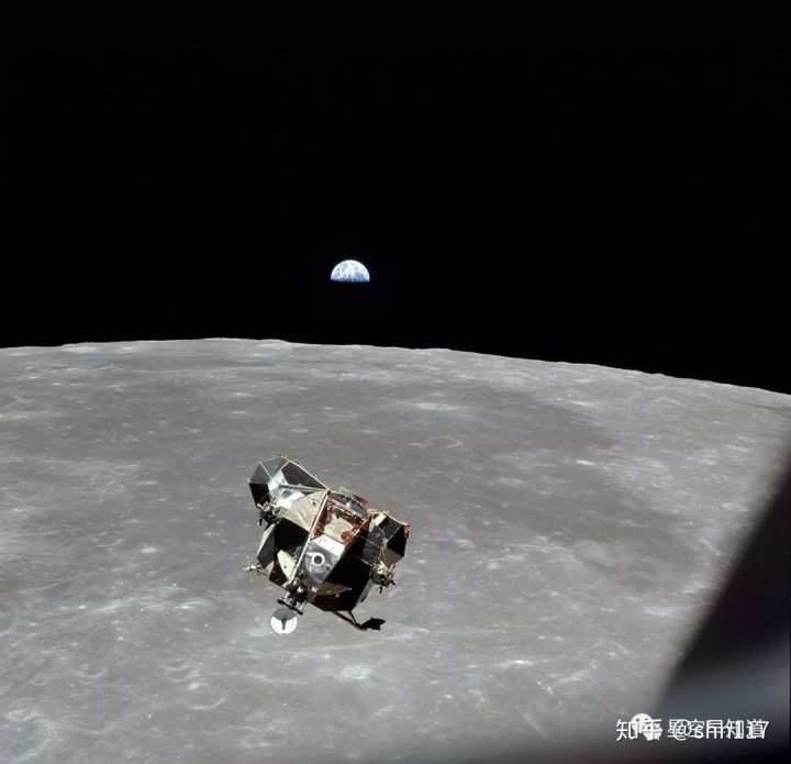 离开指令舱,正缓缓朝着月面降落的阿波罗11号登月舱:“鹰”
