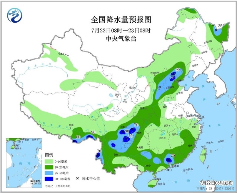 今天,黑龙江东北部、山西中东部、河北中北部、北京、天津北部、四川中南部、云南北部和西部等地的部分地区有大雨或暴雨(50~90毫米),局地并伴有短时强降水、雷暴大风等强对流天气。
