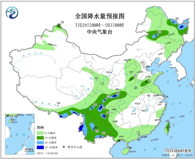 今明天,中央气象台预计,受东移高空槽和副热带高压共同影响,四川盆地、华北及东北地区等地有较强降雨。