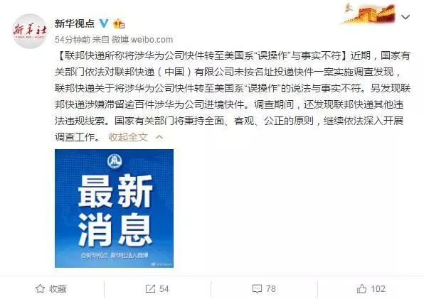 据新华社消息,近期,国家有关部门依法对联邦快递(中国)有限公司未按名址投递快件一案实施调查发现,联邦快递关于将涉华为公司快件转至美国系“误操作”的说法与事实不符。