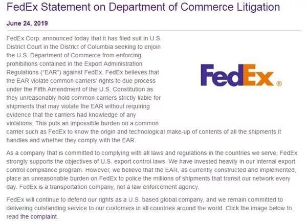 在这一声明中,联邦快递也指出,出口限制规定“基本上就是要求联邦快递监督其每日承运的数以百万计包裹中的物品,而不管这从物流和经济角度来说,几乎是不可能完成的任务,许多情况下也是不合法的”。