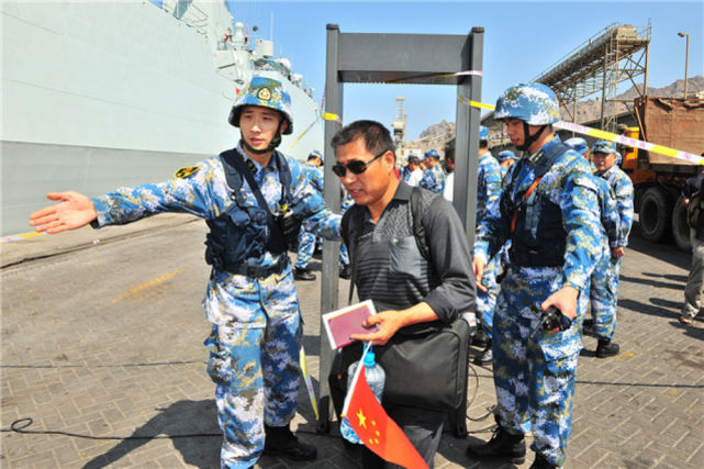 中国海军第十九批护航编队临沂舰抵达也门亚丁港,帮助准备撤离的中国同胞进行安全检查(2015年3月29日摄)。新华社发(熊利兵 摄)