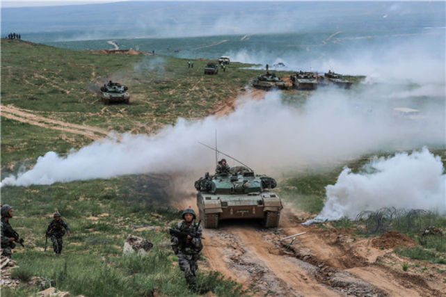 在“跨越-2016·朱日和A”演习中,红军参演部队步兵和坦克协同作战(2016年7月19日摄)。新华社发(王佳寅 摄)