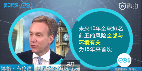 世界经济论坛(WEF)调查显示,未来10年全球排名前五的风险全部与环境有关,为15年来首次。