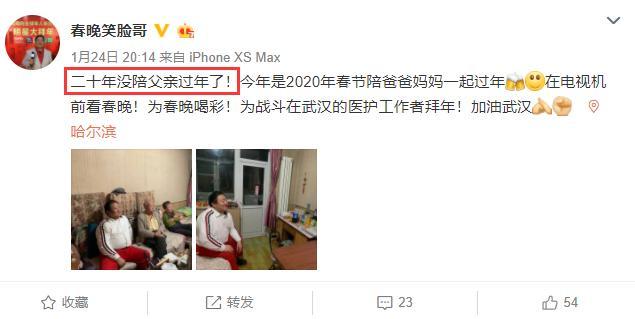 日前,“春晚笑脸哥”在微博上晒出了在家里陪伴老父亲在电视机前看春晚的照片,解开了今年春晚没有上镜的谜团,原来他根本就没去现场看春晚,而是回到了哈尔滨老家过年去了。“春晚笑脸哥”在微博上发文表示自己有20年没陪父亲过年(大年三十)了,今年2020年春节陪爸爸妈妈一起过年,在电视机前看春晚,为春晚喝彩。