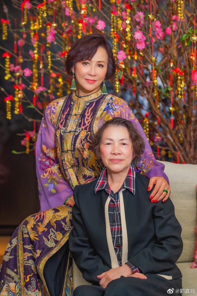 刘嘉玲脸上画着精致的妆容,一头短发显得很是精神,戴了一堆祖玛绿耳环,坐在沙发一角,双手扶着母亲的肩膀,刘嘉玲的母亲也是十分显年轻,脸上没有太多的老态,看来过得非常不错。