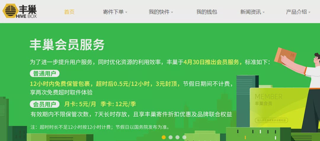 在此之前,丰巢于4月30日推出会员服务:普通用户可以免费保管用户包裹12小时,超时后,每12小时收取0.5元,3元封顶,节假日期间不计费;会员用户月卡每月5元,季卡每季12元,有效期内不限保管次数,7天长时存放,有效时长30天;季卡会员,不限保管次数,7天长时存放,90天有效。