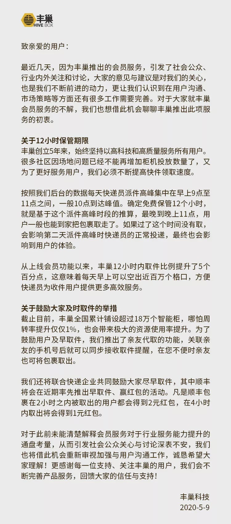 5月9日晚间,丰巢智能柜发布致用户的一封信。在信中,丰巢科技解释了推出会员服务的初衷。