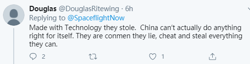 另外,一些境外反华势力的水军,也在用同样的言辞侮辱着中国和中国人,说中国“会将病毒带到外太空”,探索火星是为了“找新的蝙蝠去吃”,或是“你们的技术都是偷来的”。