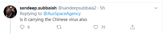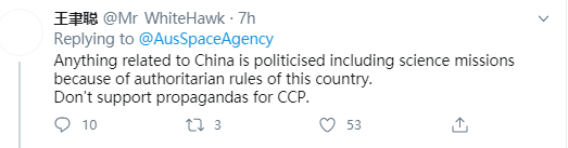 在澳大利亚宇航局发布的关于中国“天问一号”升空的帖文中,我们还发现一个躲在澳大利亚的反华分子在无脑地宣称中国的火星项目是“政治化”的,并要求人们不要支持中国的项目。