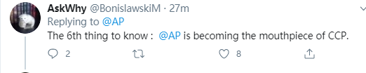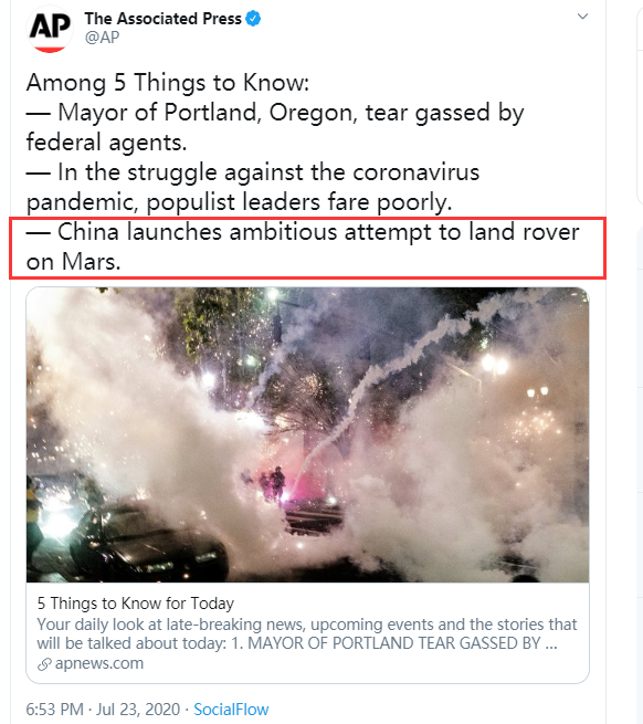 下图中这个美联社在其推特账号上发布的新闻帖就极具代表性。这则帖文共列出三条新闻,其中前两条是美国的种族矛盾和疫情问题,第三条则是关于中国“天问一号”升空的。