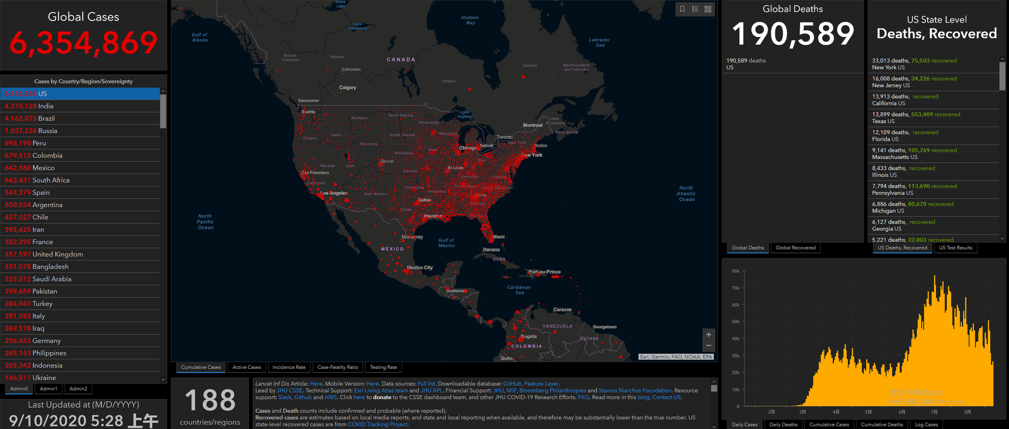 (观察者网讯)根据美国约翰斯·霍普金斯大学网站实时数据,截至北京时间9月10日上午5时28分(美东时间9月9日17时28分),美国累计新冠确诊病例达到6354869例,24小时新增32919例,累计死亡达190589例,24小时新增1100例。