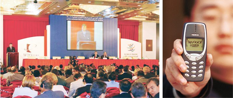 2001年11月10日,在卡塔尔首都多哈,世界贸易组织第四届部长级会议全体协商一致,审议并通过了中国加入世贸组织的决定。左图为大会现场(新华社记者 王建华/摄);右图为当时受到众多用户欢迎的手机短信图片(新华社记者 侯俊/摄)。