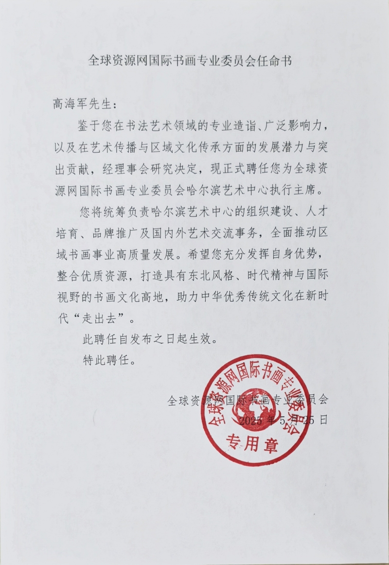 当天,委员会同步宣布任命军旅书法家高海军先生为哈尔滨艺术中心执行主席。高海军先生书艺根基深厚,军旅出身,曾多次获得全国书法赛事金奖,其作品被中国集邮总公司、艺术瓷企、文化机构等广泛采用,是兼具传统修养与当代传播力的书画名家。