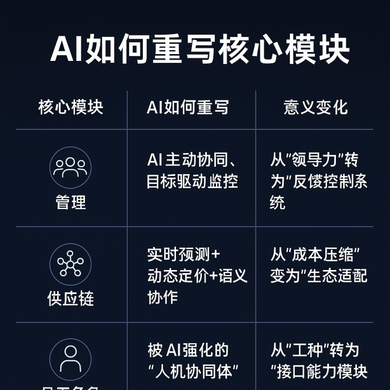一旦AI深度嵌入价值链,组织就不再是“人搭起来的流程”,而是“系统自动协调的人机生态”。