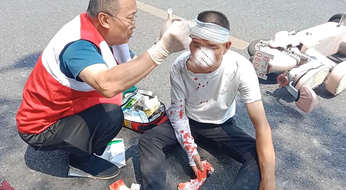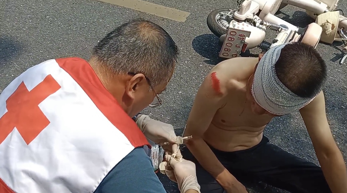 面对受伤倒地已意识丧失的电动车驾驶员,夏云剑迅速启动急救流程:他先从车上取出急救包,第一时间向客车司机询问伤者受伤原因,随即对伤者进行现场初步评估。此时伤者逐渐苏醒,但仍处于意识模糊状态。经检查发现,伤者头部右太阳穴上方存在活动性出血的开放性创口,右肩、右手臂及右腿伴多处软组织挫伤。夏云剑立即指挥周边群众拨打120急救电话和122交通事故报警电话,随后依据红十字急救规范,对各创伤部位依次实施清创消毒、加压止血、无菌包扎等处理。