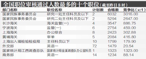 受招录人数、职位较多影响,在此次审核通过人数最多的十大职位中,国税系统占到了6个。