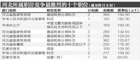而竞争最激烈的十大职位中,秦皇岛市北戴河区国家税务局的基层税务分局科员一岗最抢手,竞争比例达到了194.5:1,而这还不是最终的人数比。