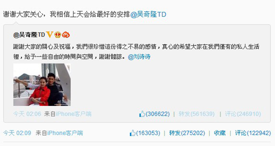 11月13日凌晨,吴奇隆在微博上公开了与刘诗诗的恋情:“谢谢大家的关心及祝福,我们很珍惜这份得之不易的感情,真心的希望大家在我们仅有的私人生活里,给予一些自由的时间与空间,谢谢体谅。”刘诗诗随后转发并说:“谢谢大家关心,我相信上天会给最好的安排。”