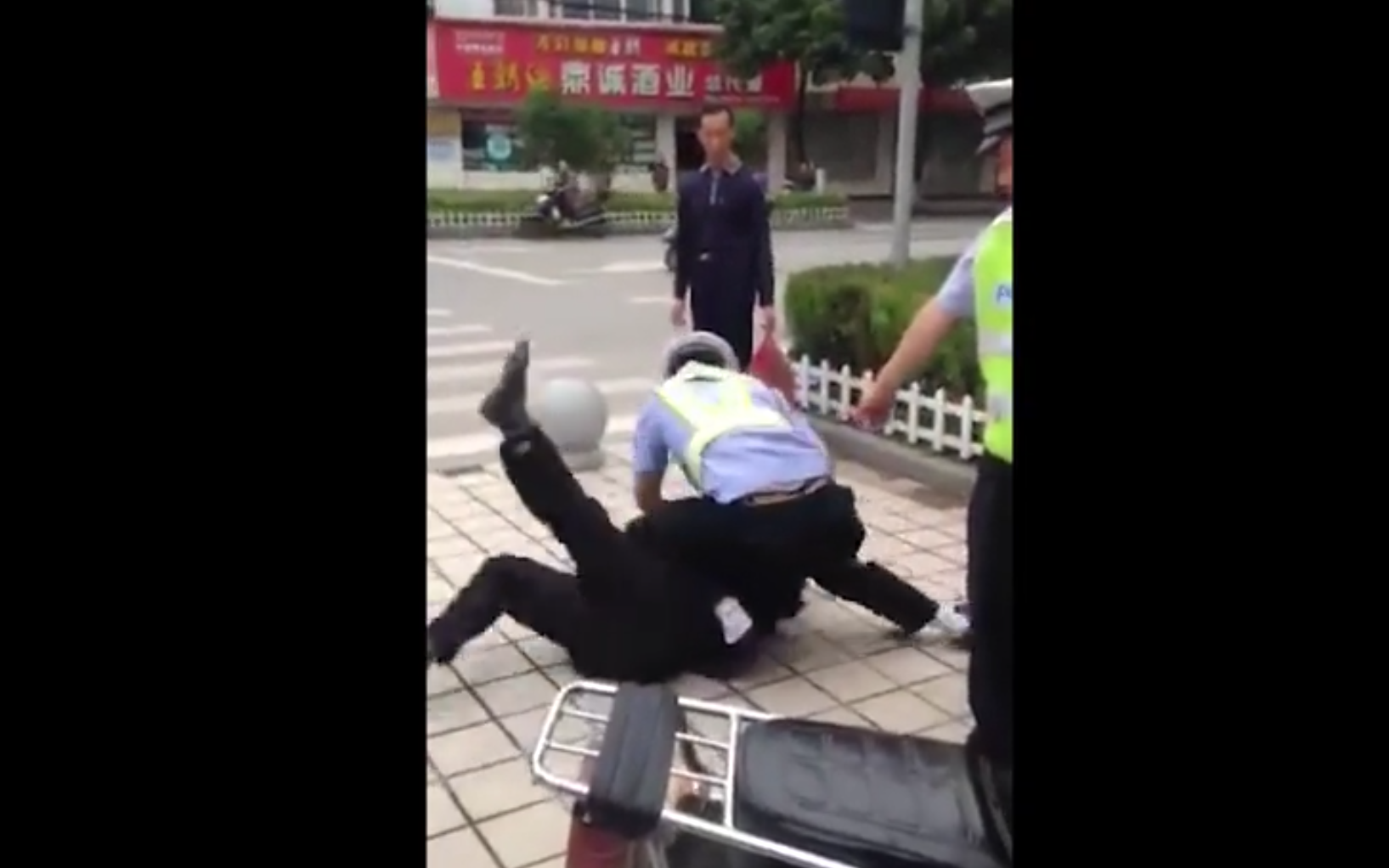 原标题:男子骑摩托拒绝检查被摁在地 警方要求交警大队长道歉