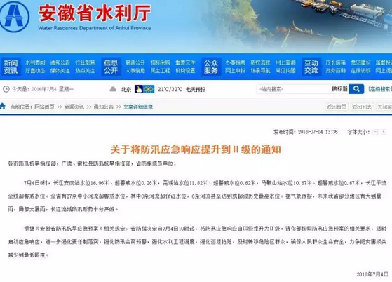 7月4日,安徽、湖南两省的防汛指挥部先后决定将将防汛应急响应由Ⅲ级提升为Ⅱ级。当日,安徽省长江全线超警戒水位。湖南省洞庭湖区全线超警。国家防总也于6月30日14时起将防汛Ⅳ级响应提升至Ⅲ级。