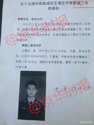 该《通知》还称,王增志逃跑时身穿迷彩服,携带一把79微冲,19发子弹,配有一名身穿军装的男子照片。