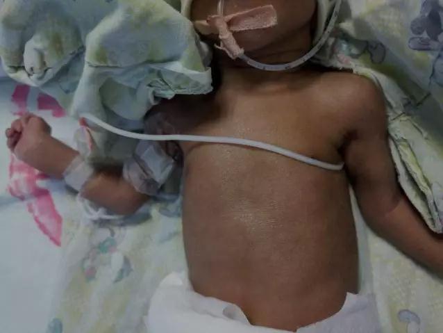 7月初,在福州市第一医院,产妇阿玲(化名)早产,怀孕仅33周,她就诞下了小黑,当时,小黑重度窒息,医生紧急抢救后,他立即被转送到新生儿科继续治疗,戴上了呼吸机。医生发现,小黑很瘦弱,躯干只有成人的巴掌大,且全身黑得像包公,尤其是颧骨、颈部、手肘、关节等皮肤更黑,连指甲都是黑的,更奇怪的是,他的阴茎仅1厘米长,缩成一团,黑得跟炭一样。